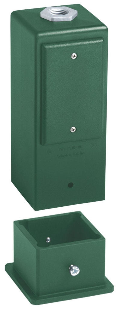 Arlington's Gard-N-Post. 9″ Post/ Deck Mount support for outdoor light fixtures and or a GFCI wiring device. two 1/2″ knockouts. two piece design. Base mounts directly to deck or post. Post mounts to base with set screws. Metal Grounding bushing assembly included. Color Green. Color Permanent, No chipping.Specifications: