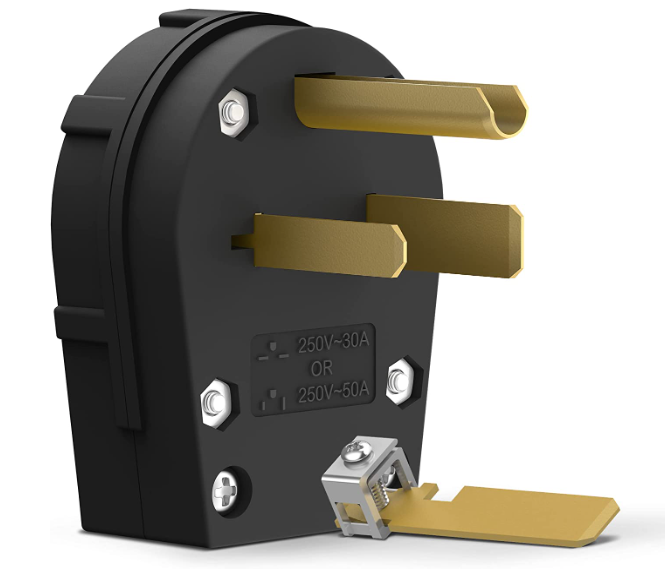 This NEMA 14-30/50P plug is made from durable thermoplastic material and features solid brass blades. Constructed to withstand the high impacts of and long-term wear and tear of industrial applications. The 66351-BK plug is designed for heavy-duty applications such as dryers, generators, or electric cars. It includes interchangeable blades for either 14-30P or 14-50P applications and it is rated to deliver up to 50A of power.Specifications: