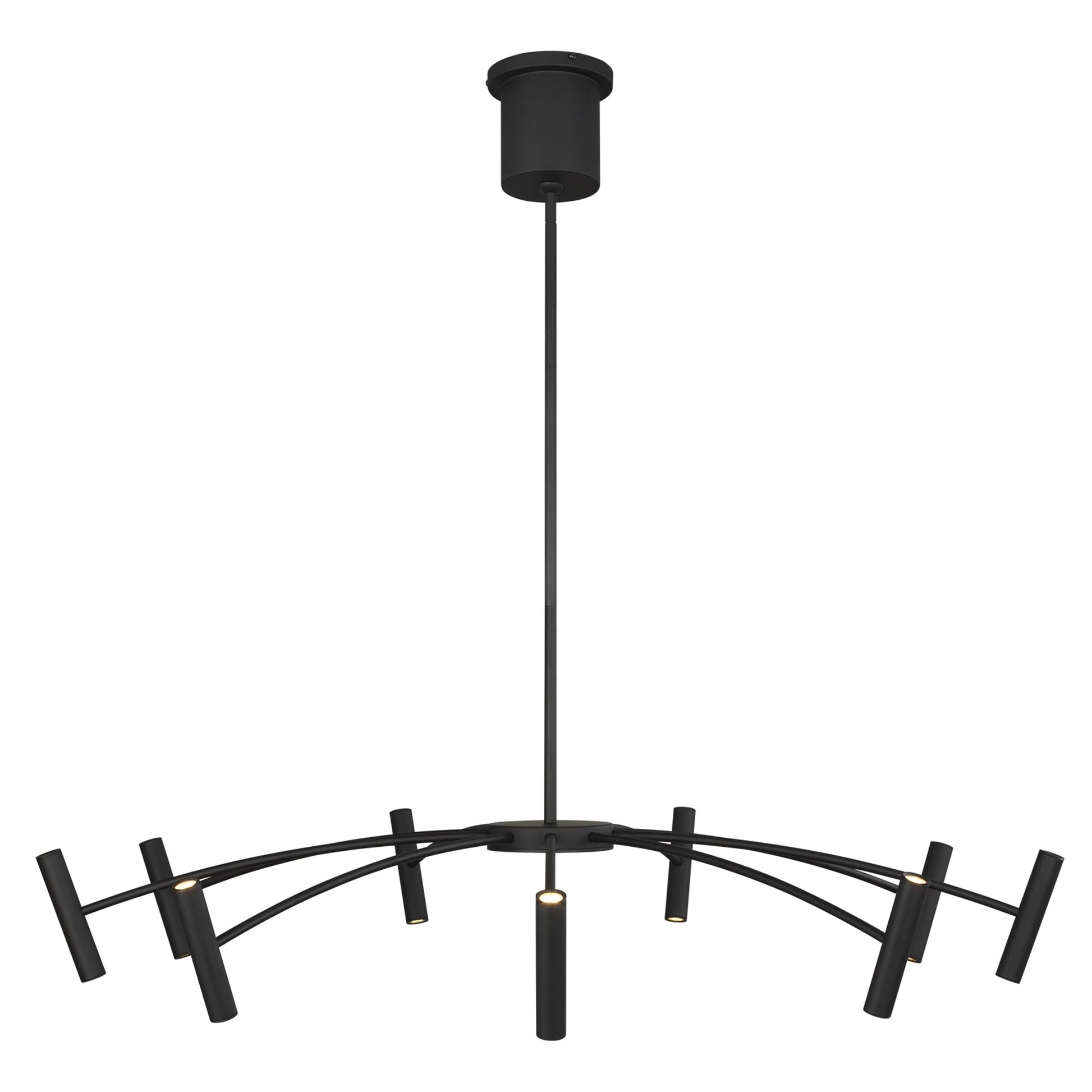 This Aerial chandelier by Sean Lavin features symmetrically spaced arched rods supporting a ring of slim cylindrical heads. The cylinders produce up and down illumination while concealing the integrated LED light sources. Offered in Matte Black. A great piece to coordinate with the smaller scale Aerial chandelier in your open living space, dining area and foyer. Lamping options are compatible with most dimmers. Refer to the Dimming Chart for more information.