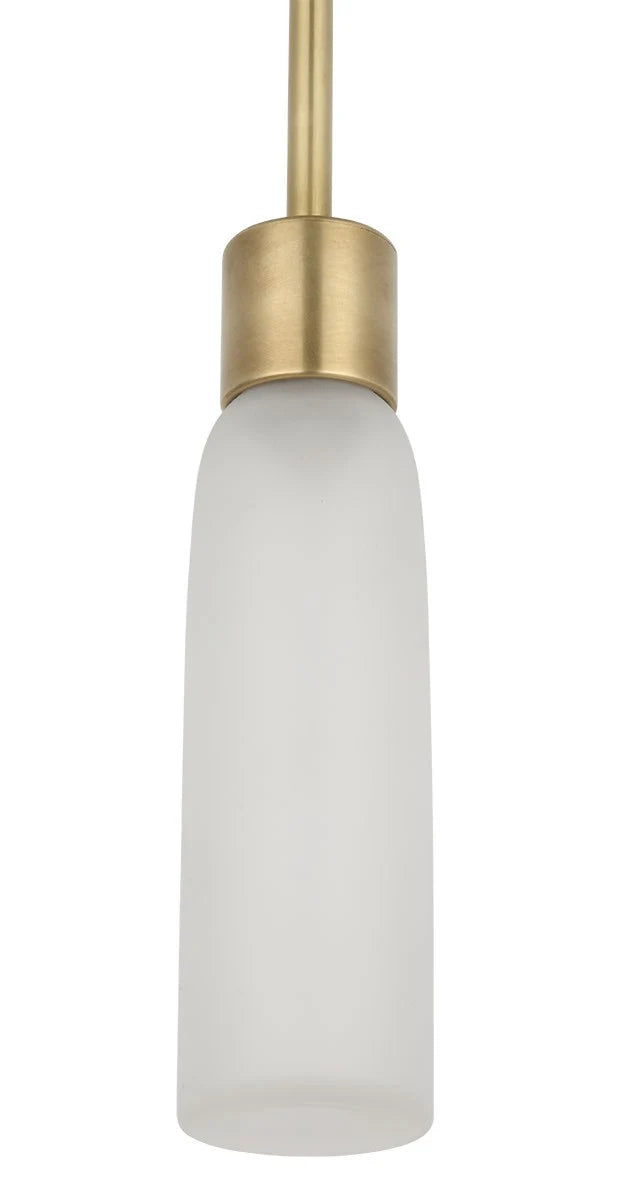 The Visual Comfort Architectural Kelly Wearstler Volver 2.5" LED Line-Voltage Pendant in Hand Rubbed Antique Brass showcases a refined flute-shaped etched glass shade with a soft dimple accent. Its integrated 11.3W LED produces 212 lumens at 2700K with 90 CRI, offering warm, even illumination. Ideal for modern or transitional interiors, this dimmable pendant includes multiple stem lengths and is sloped-ceiling adaptable up to 22.5°, combining minimalist form with artisanal texture.