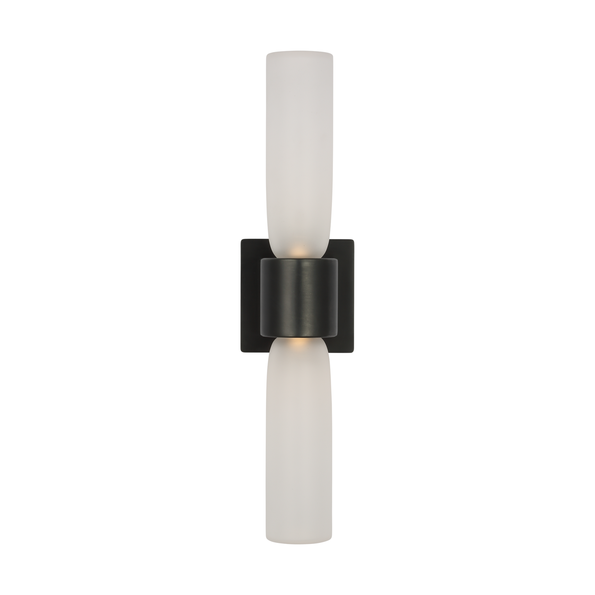 The Visual Comfort Architectural Kelly Wearstler Volver ADA Sconce features a sculptural dual-light design blending artisan glasswork and modern minimalism. Each etched blown glass shade showcases a soft flute form with a subtle dimple, creating an elegant diffused glow. This 10.4W integrated LED sconce delivers 223 lumens at 2700K with a 90 CRI. Fully dimmable via ELV, TRIAC, or 0–10V systems, this 18.6-inch wall fixture is ideal for hallways, bedrooms, or bathrooms. ADA compliant and damp rated.