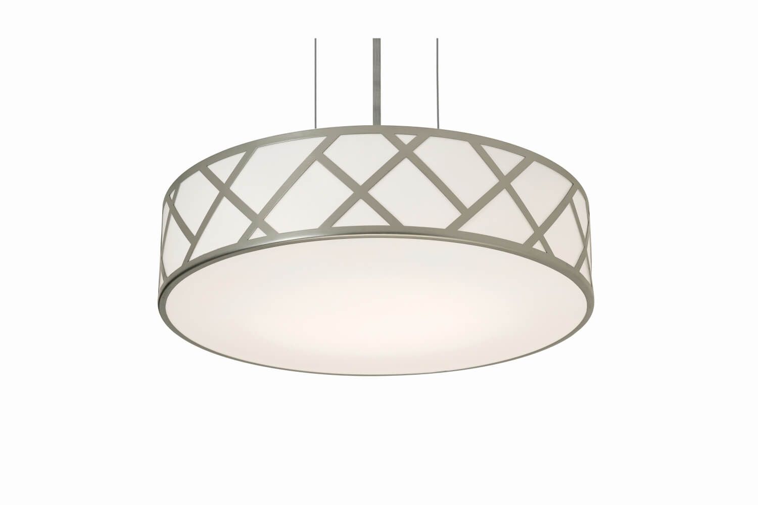 Stylish pendant with a metal geometric pattern accentFull acrylic diffuser on side and bottom