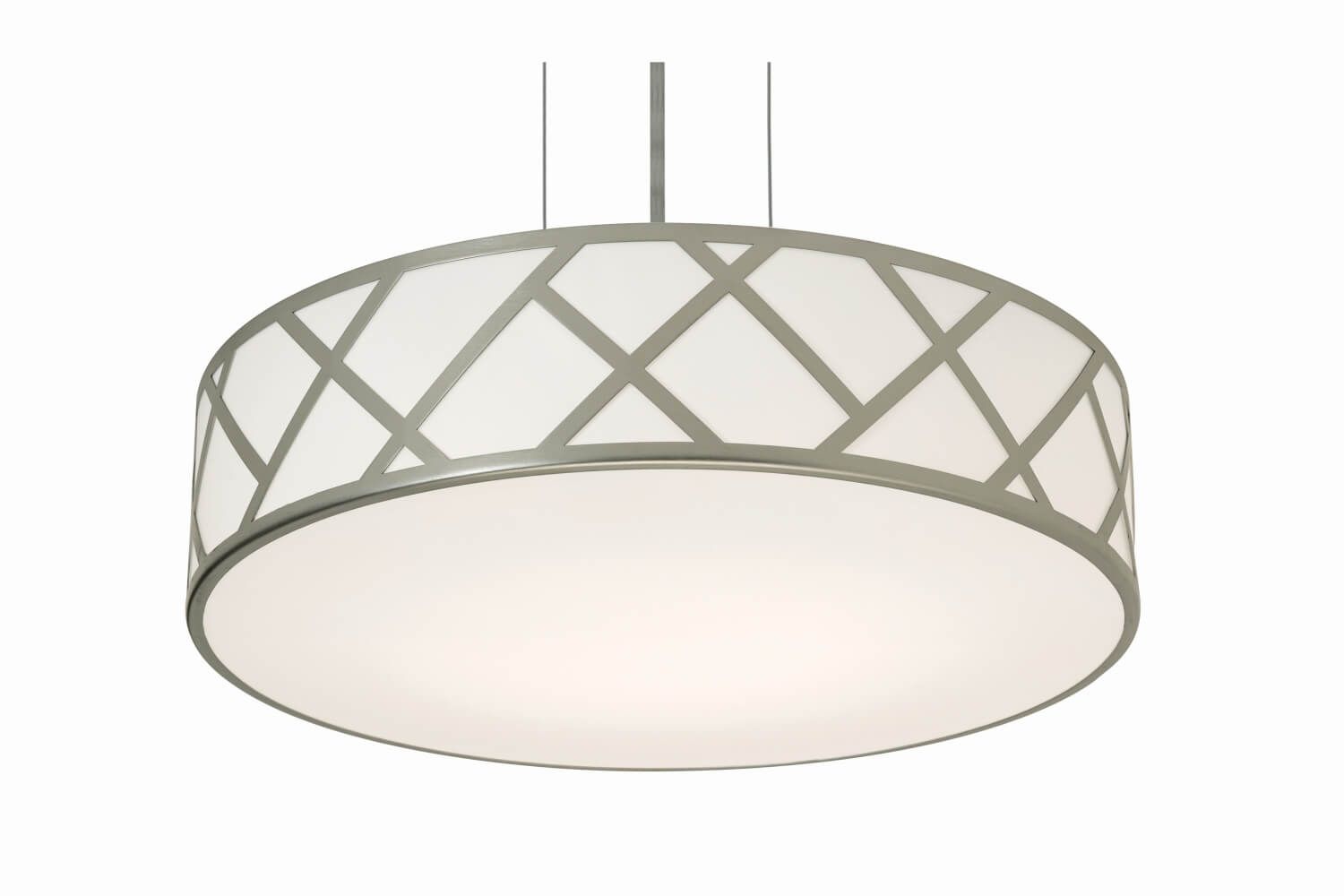 Stylish pendant with a metal geometric pattern accentFull acrylic diffuser on side and bottom