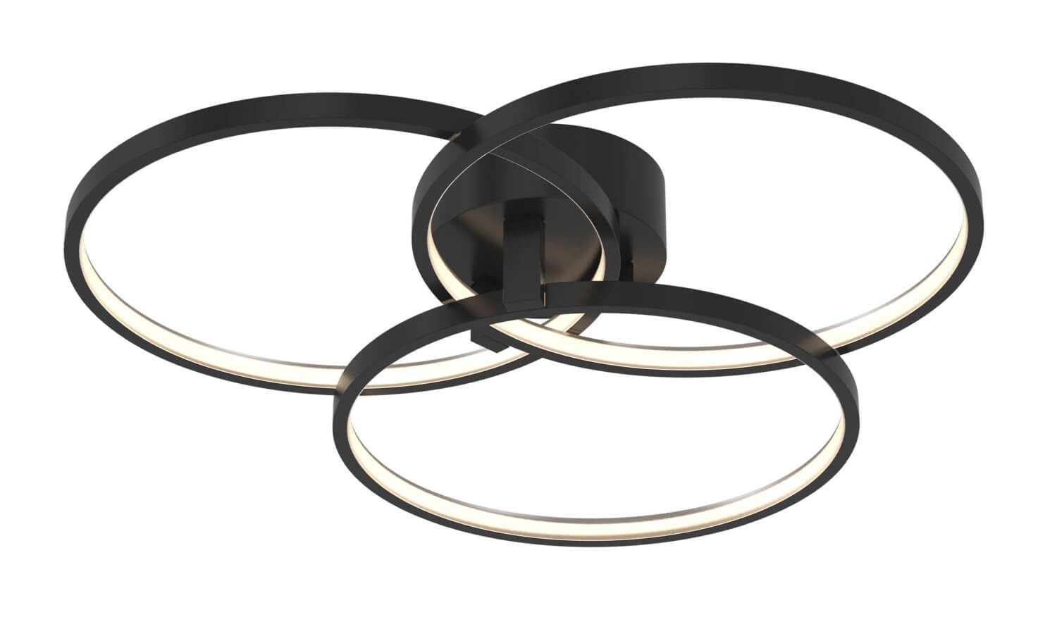 AFX Lighting's 20-in 33W Orion semi flush mount has a black finish with three rings that have inner illumination. It has a 3000K color temperature with a white acrylic diffuser.