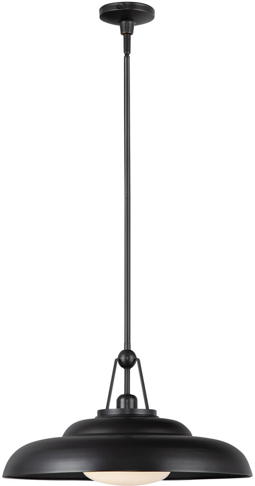 The Palmetto Pendant brings an industrial vibe of years gone by. The decorative steel frame is complemented by an inner glass diffuser, casting warm shadows across your room.