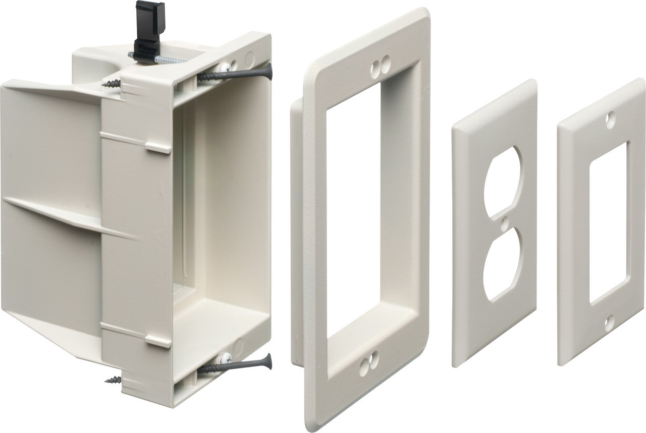 Arlington's non-metallic recessed indoor InBox allows items such as furniture or televisions to be placed closer to the wall. Our InBox uses mounting wings to attach to the wall, so it is ideal for new or retrofit construction. This single gang 21.0 cubic inch InBox comes in black, is cULus listed, and has a two hour fire rating. It comes with the recessed box, NM94 cable connector, trim plate, standard duplex face plate, standard GFCI face plate, and mounting/installation screws.