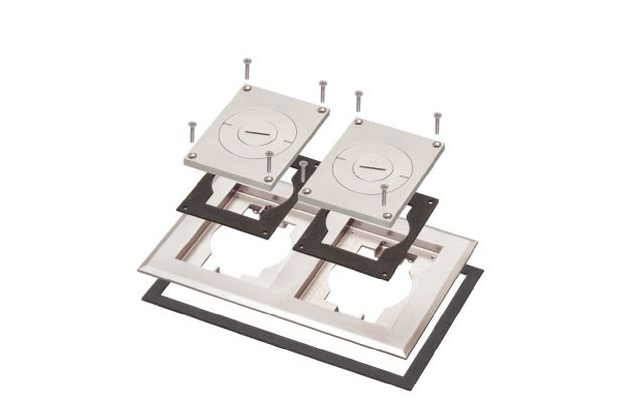 Plated Nickel, two gang frame and cover with furniture feed inserts. Includes two gang frame with gasket, (2) gasketed covers with combo 2" and 3/4" threaded holes and mounting screws.