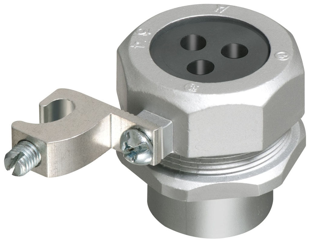 3/4" combination Rigid to wire grounding and bonding bushing. Zinc die-cast. Holds up to (3) cables with outside diameters of .425 to .280.