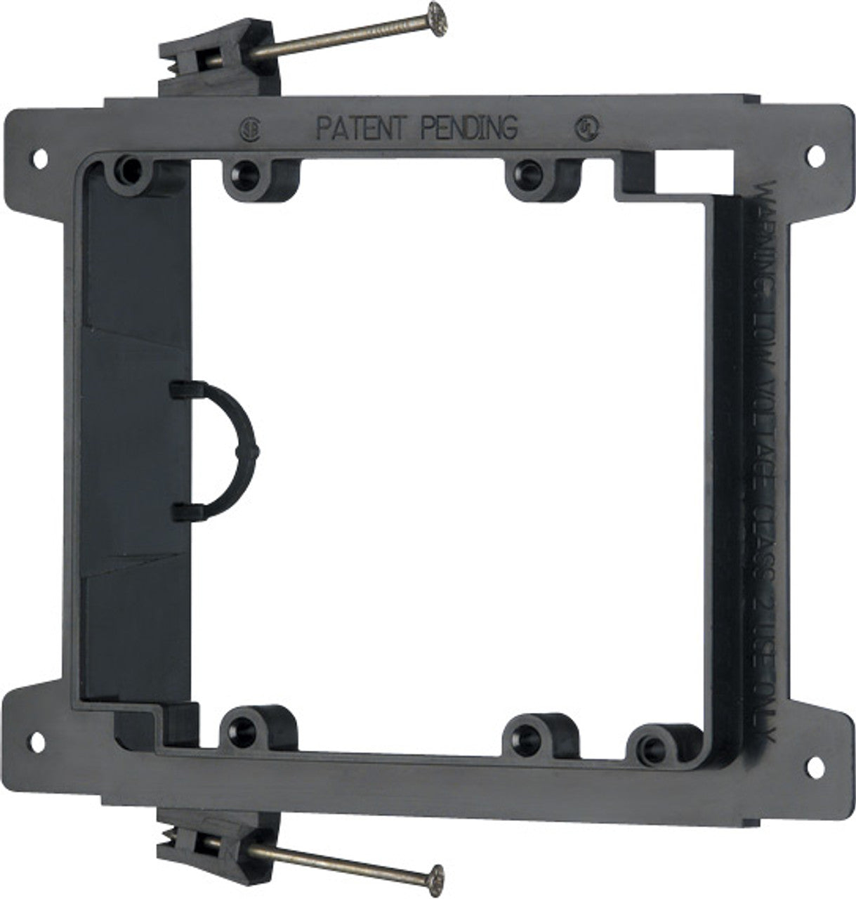 Nail on, Two gang, Low Voltage mounting bracket for new construction on wood studs. Built in loop to tie off cable.Specification: