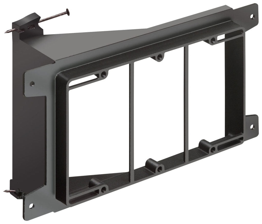 Nail on, Three gang, Low Voltage mounting bracket for new construction on wood studs. Built in loop to tie off cable.