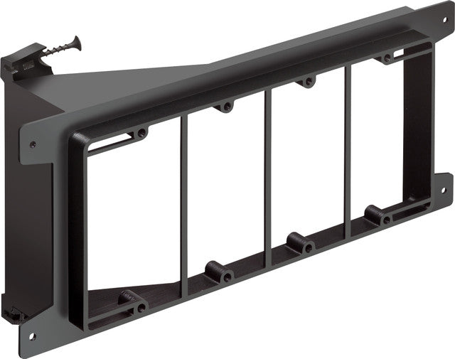 Screw On, Four gang, Low Voltage mounting bracket for new construction on wood studs. Built in loop to tie off cable.Specification: