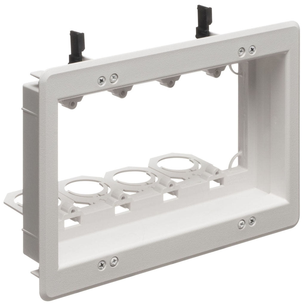 Recessed low voltage mounting bracket for old or new construction. Designed to install low voltage class 2 wiring only. White Paintable. Four Gang.Specification:
