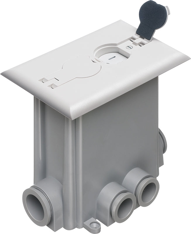 Non Metallic concrete floor box with non metallic covers for new concrete pours. White with flips lids. Includes Box, Mud Cover, Four 3-1/4 plugs, two 1" plugs, 1/8" spacer 1/4" spacer. one 1/2" spacer, one 3/4" spacer, Mounting bracket, Duplex receptacle, Gasketed cover plate.Specification: