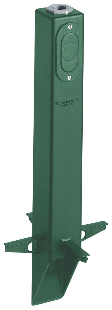 Arlington's Gard-N-Post. 19.5″ support for outdoor light fixtures. Built in stabilizers for extra stability. Openings in stabilizers allow for insertion of extra support material. Angle Cut post for easy access to underground wiring. one 1/2″ Knockout to cover photocell installations. Color Green. Color is permanent, no chipping.Specifications: