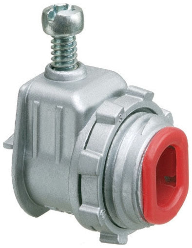 Zinc Die-cast, 1/2" Knockout, Screw Saddle Type "Take All" Connector for Steel and Aluminum Jacketed Cables. Provided With Insulated Throat. Rectangular End Stop. Secures Into Knockout With Locknut.