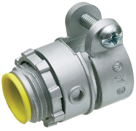 Zinc die-cast, single screw, 2" knockout squeeze connector with round end stop. For Flex, AC, MCI cable. Concrete tight when taped. End stop diameter: 1.935. With insulated throat