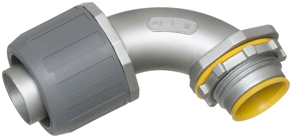Arlington's SNAP2IT zinc die-cast, push on, metallic, liquid tight connector. Trade Size 1″. 90 degrees. With insulated throat.