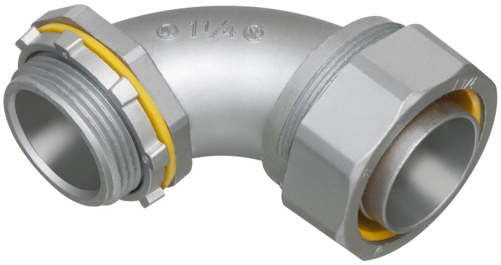 Arlington's Straight, zinc die-cast connector for use with metallic or non metallic liquid tight conduit type B only. 1-1/2″ Trade Size. 90 degrees.