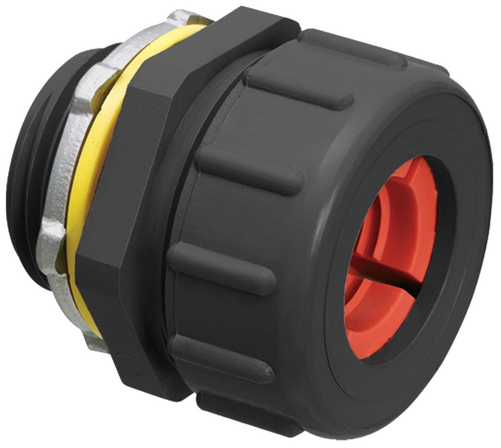 Non-metallic, Liquid-tight, Black, and Oil-tight Colorgrip Strain Relief Cord Connector Furnished With a Sealing Ring and Locknut. Supports .625 to .750 Cord Range With a 1 Inch Trade Size.