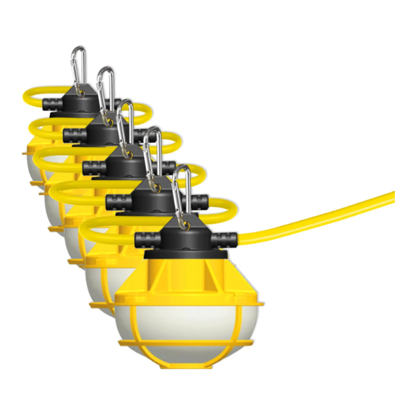 Light up the worksite with the Feit Electric premium WORKSL50-5 high output string work light. Designed for professional use, this item features a 50-foot heavy-duty 18/3 grounded power cord and five shatter-resistant LED light heads. They are wet rated, for use outdoors. Lamp heads are spaced 10 feet apart and each has its own carabiner clip for quick and easy setup. Each lamp head emits 1600 lumens, for a total of 8000 lumens. Each work light string is linkable with up to 10 others, for greater area coverage or brighter illumination. These long-lasting LED lights are rated for 50,000 hours of life.Specifications: