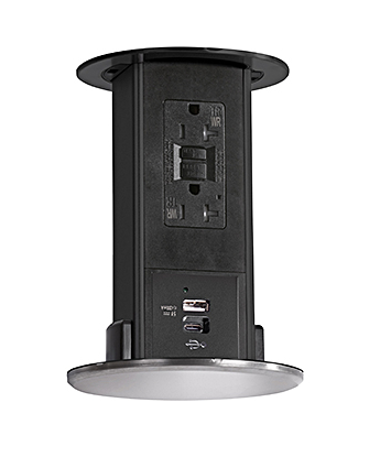 The Lew Electric UCPDR-20-SS-USB/GFI under cabinet pop down power outlet is designed to be hidden inside a cabinet where it is not possible or convenient to have a wall outlet. When closed, there is a round seamless solid piece of real stainless steel that hides under your cabinet trim. When power is needed, simply press up on the spring-loaded top and the cylindrical unit comes down from under the cabinet. The outlet is 20 Amp rated, integrated GFCI protection, has tamper resistant (TR) plugs, and is also weather resistant. The unit also contains two separate USB charging ports. USB Ports are Class 2 5VDC 3.6A. Includes dust covers for USB ports..Specification: