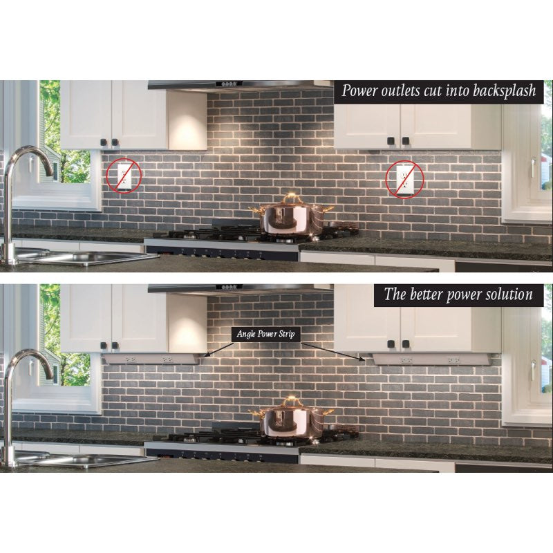 Task Lighting's duplex receptacle angled power outlet strips are a more aesthetically pleasing and architecturally oriented upgrade from the standard power outlet strip. They are great options to keep power outlets out of sight and tucked under cabinets, islands or counter tops, providing a perfect alternative to standard outlets that disrupt the beauty of your back splash. Their angled design allows for easier access to power outlets while keeping them out of the way. Great to utilize in kitchens/bathrooms, garages, offices, schools, hospitals, airports and more.